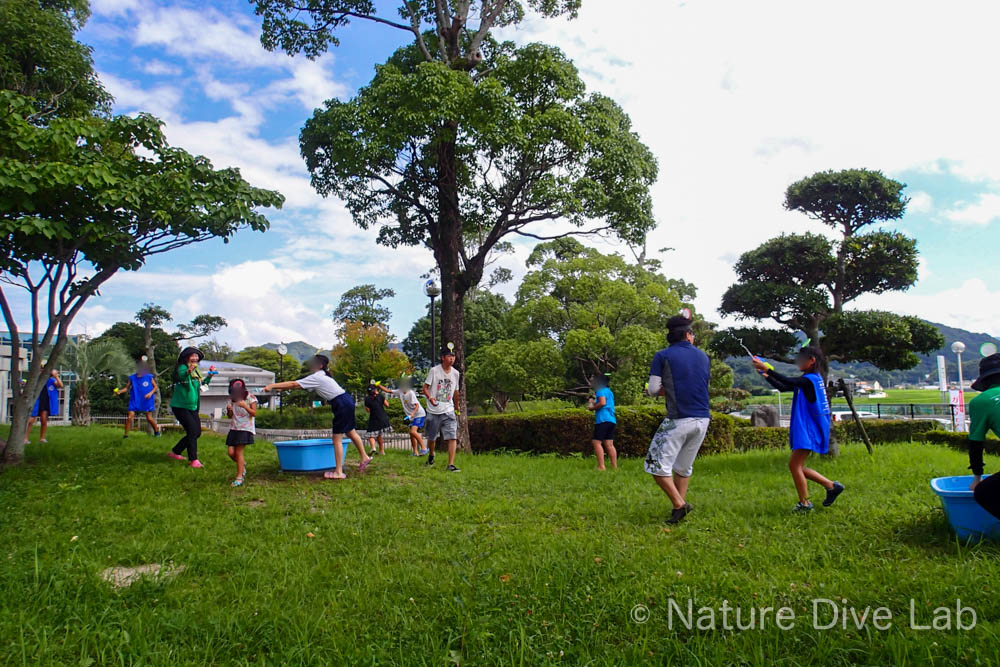 2チームに分かれ、各チームで仲間に水鉄砲を分配!
