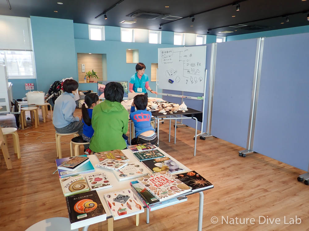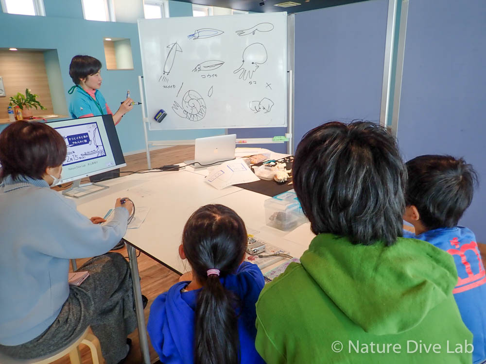 軟体動物の分類についてお話したあとは、実際に貝を使ってお話したり、動画を見たり、ボードに書いて説明したり、参加者のみなさまの質問に答える形で講座をすすめていきました〜。